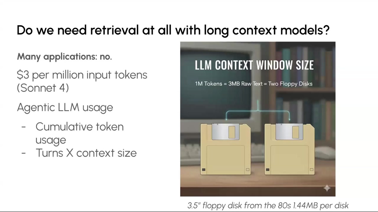 When LLMs had tiny 8k context windows, retrieval was a necessity. But now, models like Gemini can handle 1 million tokens. That’s about 3 megabytes of raw text, the equivalent of an old floppy disk.