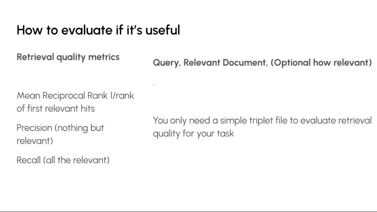 This is the step most teams skip. They jump from one new method to the next without a stable benchmark. As Nandan showed in Part 2, you need an evaluation framework before you can make good decisions about retrieval techniques. In retrieval, we use metrics like: