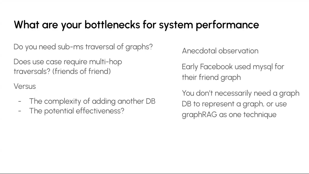 If the answer to these questions isn’t a clear “yes,” you probably don’t need a specialized graph DB. The operational complexity and cost of adding another database to your stack is high. As Jo pointed out, early Facebook ran its massive social graph on MySQL. You can get surprisingly far with general-purpose tools.