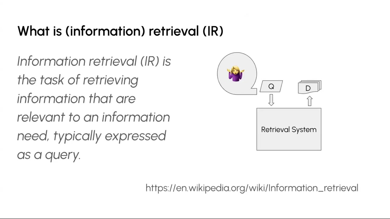 The “R” in RAG stands for retrieval. The classic information retrieval (IR) model involves a user with an information need, a query, a retrieval system, and a ranked list of documents.