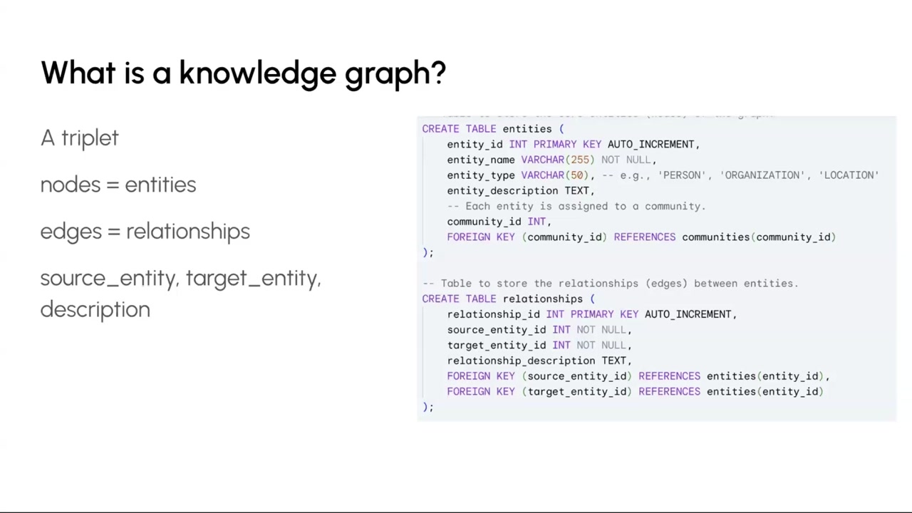 The challenge is building and maintaining the graph. A knowledge graph is a collection of triplets: (source_entity, relationship, target_entity). You can store this in a CSV file, a JSON object, or a standard relational database like Postgres.