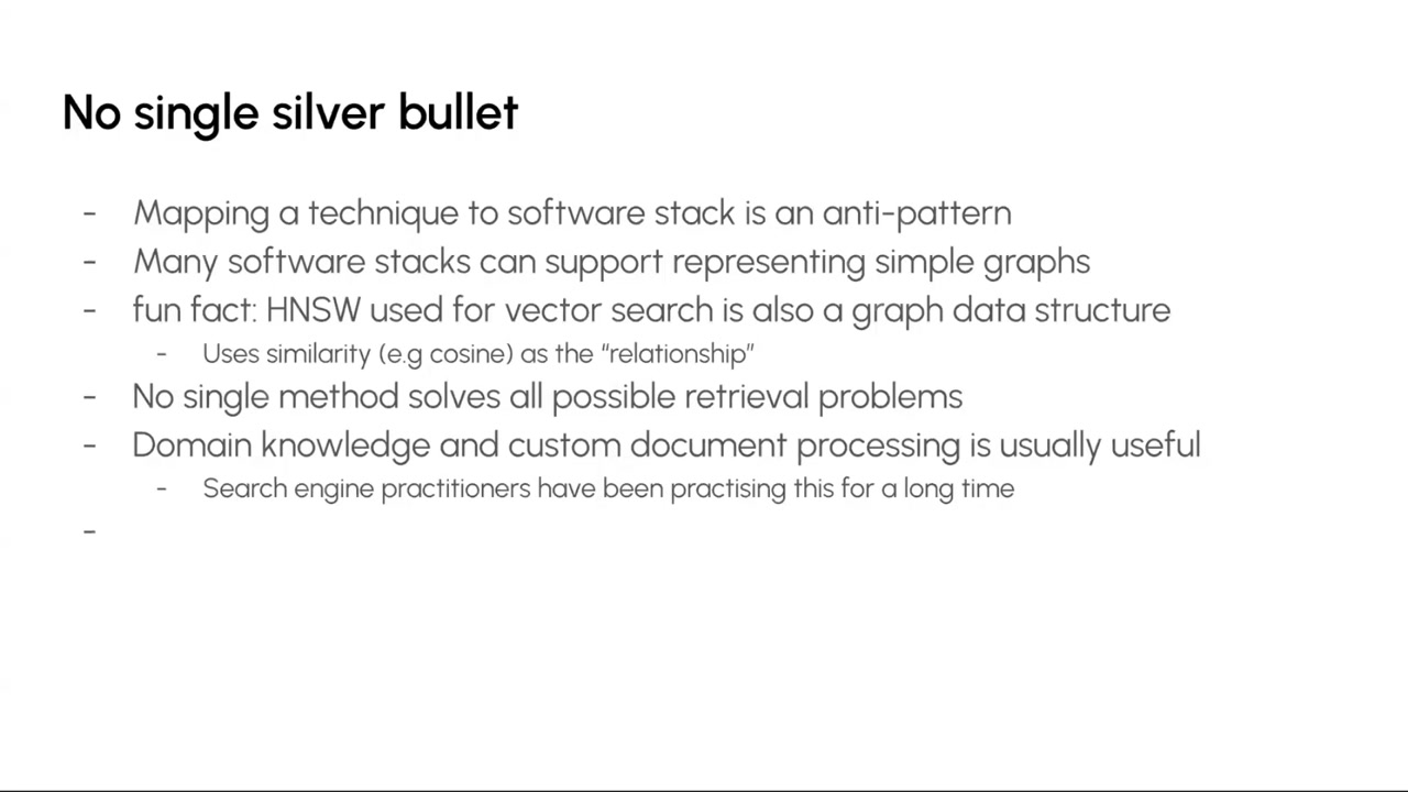 Jo’s talk reinforces this. There is no silver bullet. Before you adopt a new method like GraphRAG, build a golden dataset to measure if it improves performance (Part 2). You don’t need special tools. A knowledge graph can live in a CSV file or Postgres. Early Facebook ran their social graph on MySQL. Vector search algorithms like HNSW are already graph-based, so you can implement graph-like retrieval strategies without adding new infrastructure.